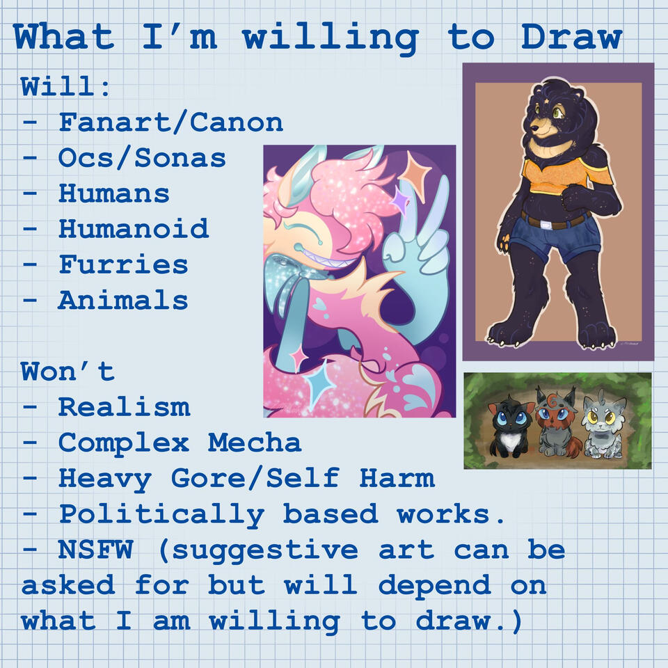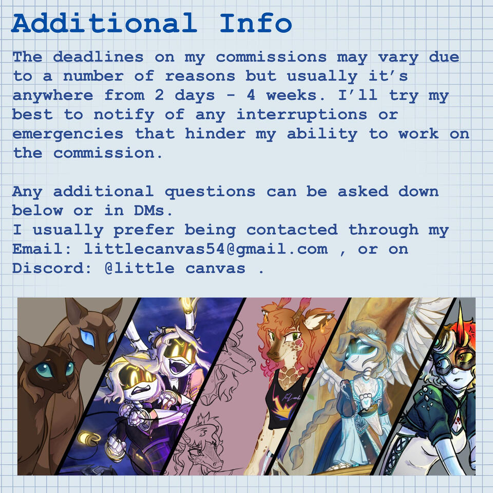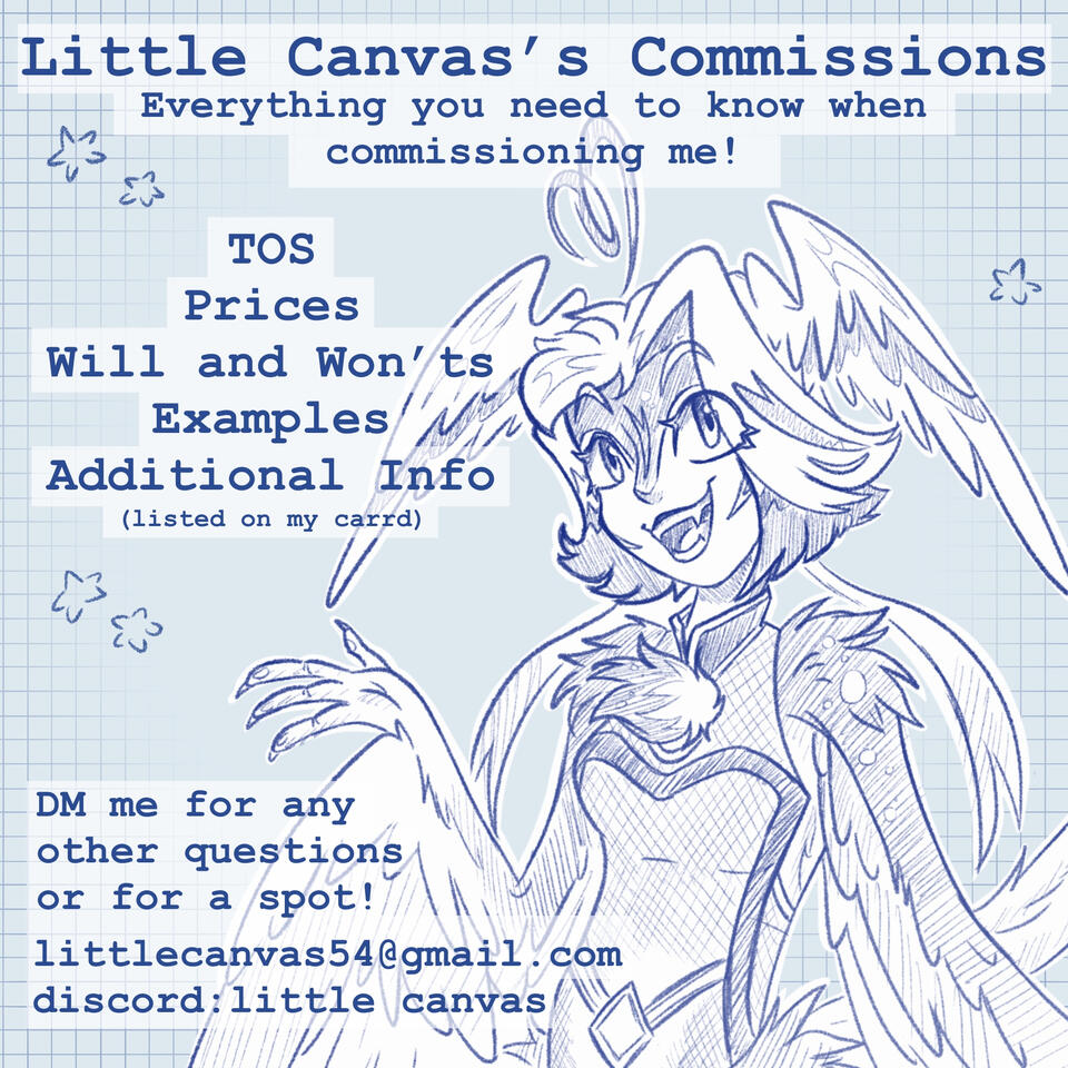I create art and other stuff sometimes and post it onto my socials a bunch. I really enjoy making up characters and designs for them in my free time.I have my commissions available and you can reach me about them through my Email: [email protected] or Discord: little canvas (#2180)