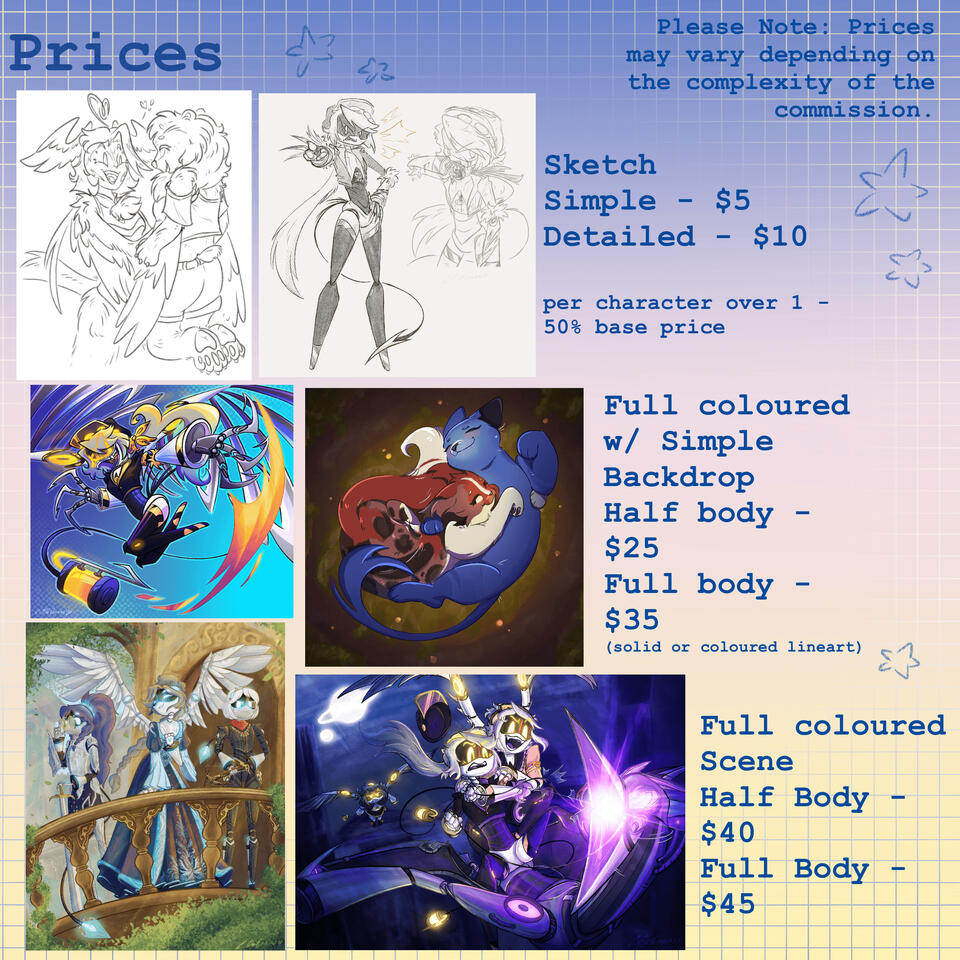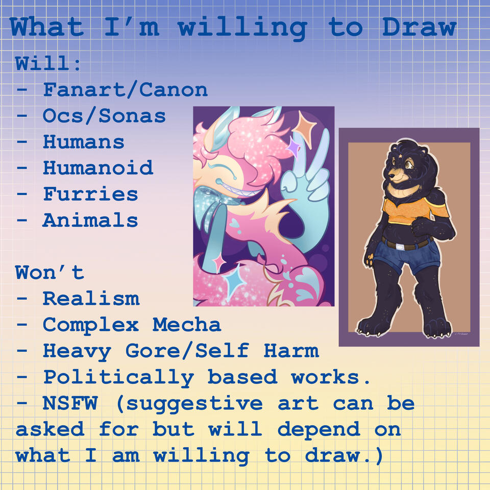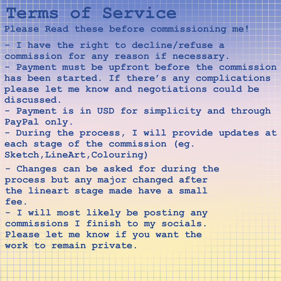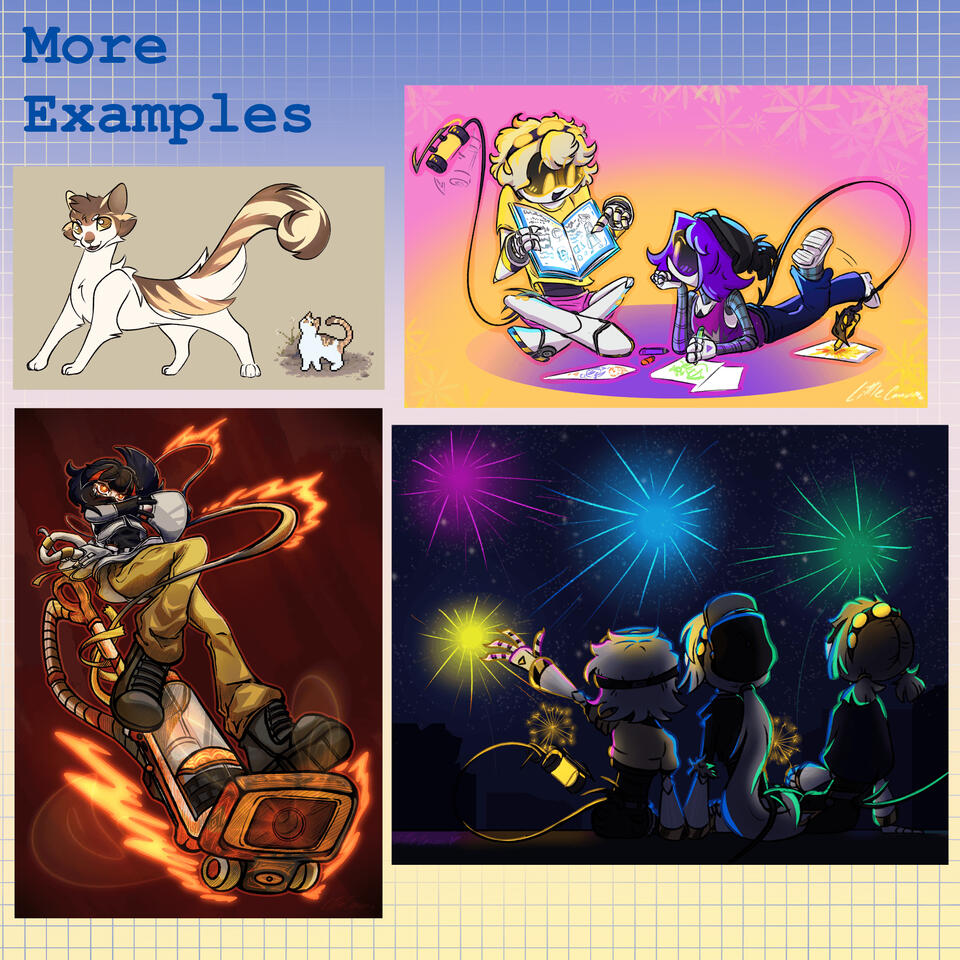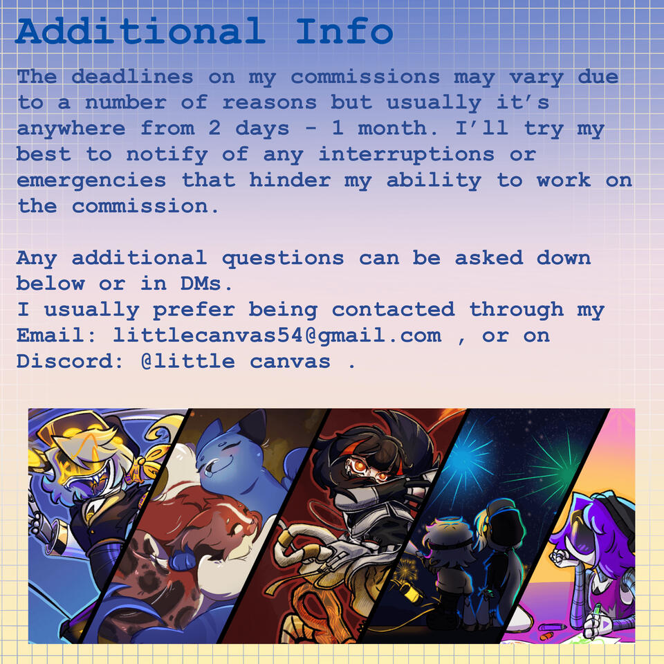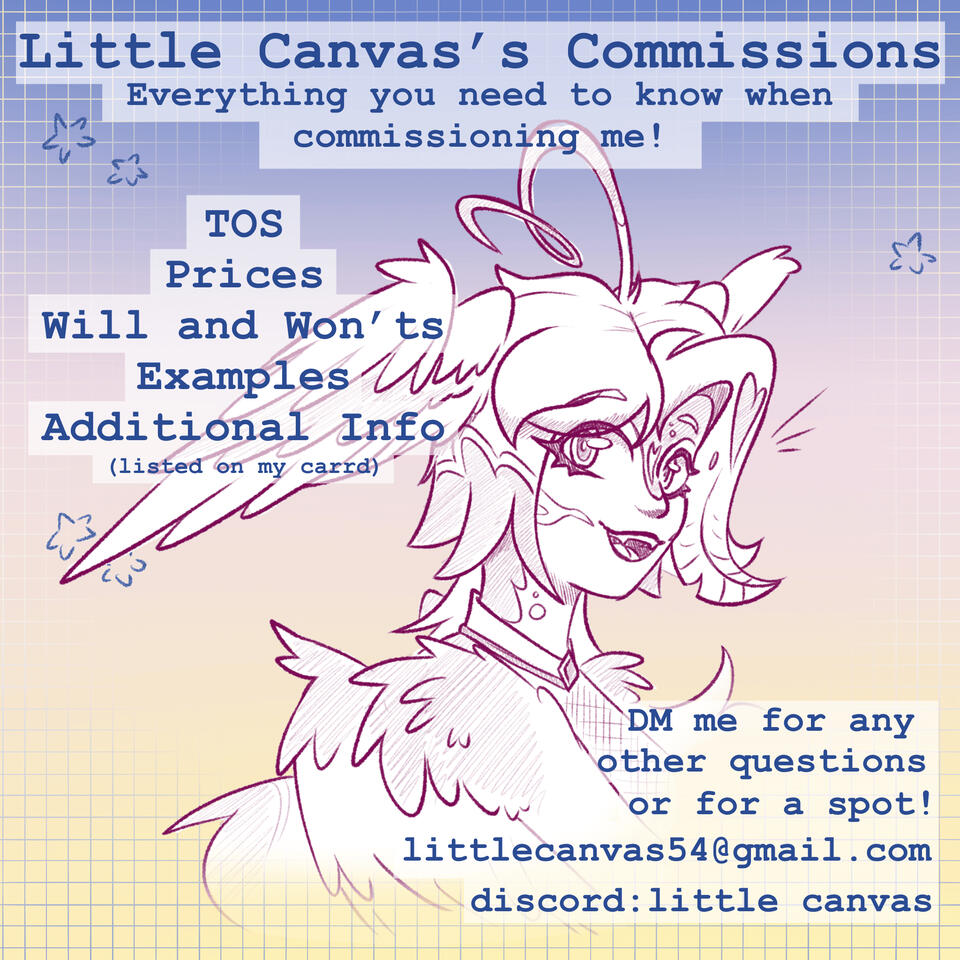 I create art and other stuff sometimes and post it onto my socials a bunch. I really enjoy making up characters and designs for them in my free time.I have my commissions available and you can reach me about them through my Email: [email protected] or Discord: little canvas (#2180)
